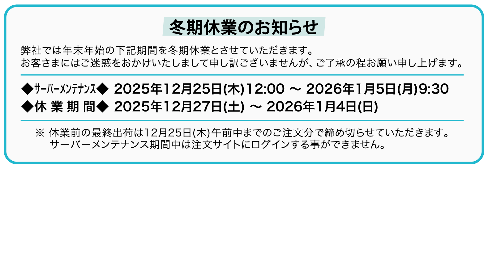 株式会社オーシーエスでは下記期間を休業とさせて頂きます。 ご迷惑をお掛けいたしますが、ご了承の程お願い申し上げます。 ▼サーバーメンテナンス期間 2025年12月25日(木)12:00 ~ 2026年1月5日(月)9:30 ※期間中は注文サイトにログインする事ができません。 ▼休業期間 2025年12月27日(土) ~ 2026年1月4日(日)